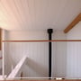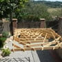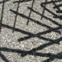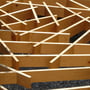 A wooden structure, perceived as floating, defines the space above a small patio and links the various elements- façade, wall, and a hackberry tree- into a cohesive composition. Its fragmented geometry evokes a weave of irregular branches, projecting a dynamic play of light and shadow onto the space below, varying with the sun’s position. This interplay, together with the gravel surface beneath, creates a fleeting, almost ephemeral visual composition. The timber framework, measuring 2 x 2 meters, is composed of 37 individual pieces joined through 81 angled wooden connections. Apart from the hanging supports, not a single nail, screw, or drop of glue was used. The structure can be fully disassembled down to its individual components.