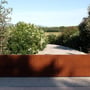 To create a dialogue with the existing wall, the concrete was given a relief pattern echoing the rhythm and proportions of the old masonry joints. The new texture, formed using varied formwork panels, imparts a subtle, soft finish to the concrete. The design is completed with new vegetation, the reuse of existing travertine slabs as a wall cap, and details in Corten steel.